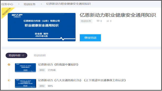 一、搭建安全培训网络学习平台:安全部将各生产工序安全风险辨识与管控、安全管理制度、安全应知应会常识制作成精短视频,上传到“亿起学”企业微信培训小程序,派发学习与考试任务,进行在线有效跟进,确保培训覆盖率与考试合格率100%,在不占用工作工时的情况下,可灵活提升安全培训的有效组织实施率。